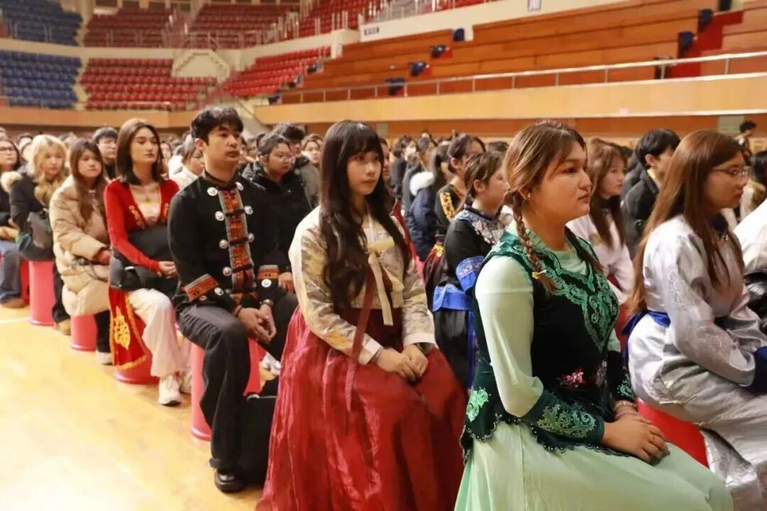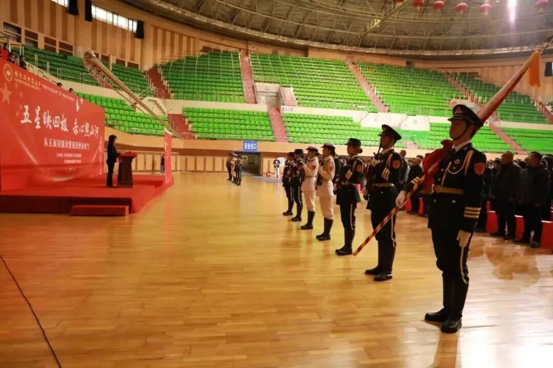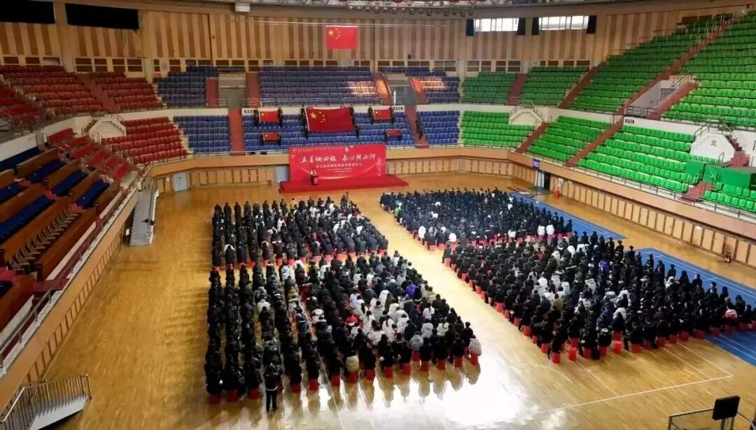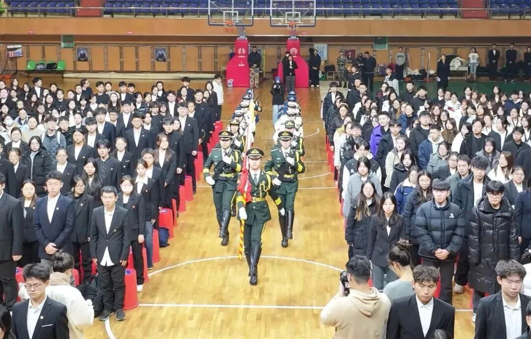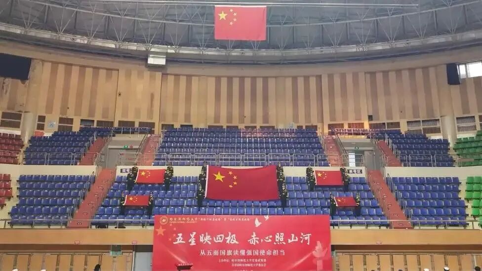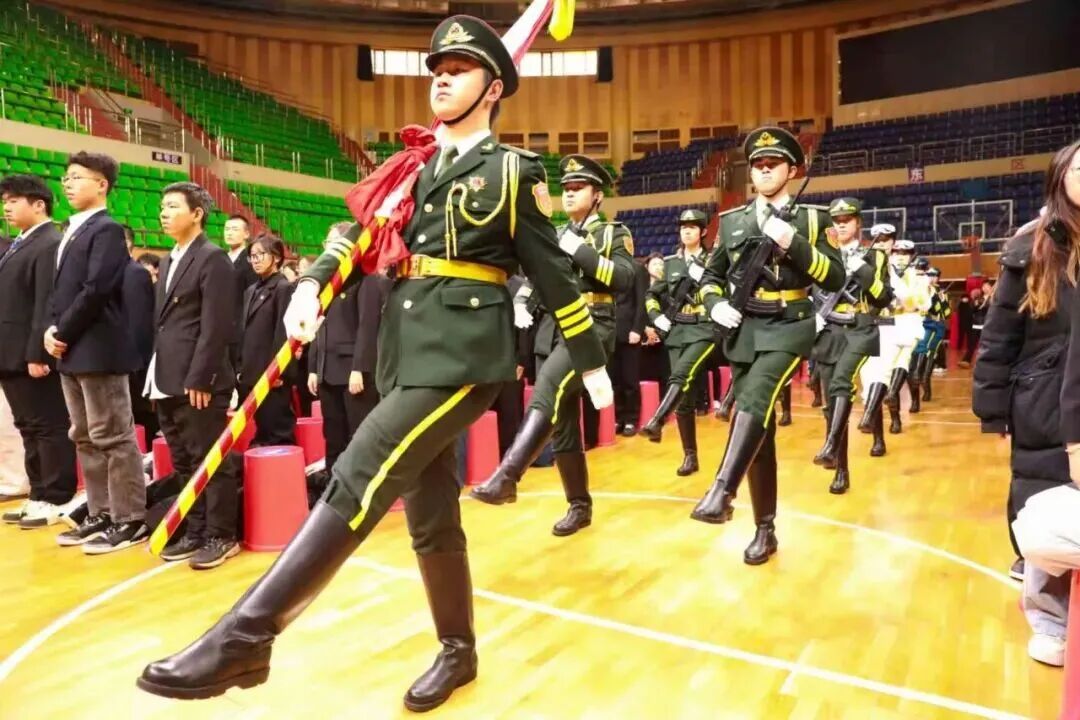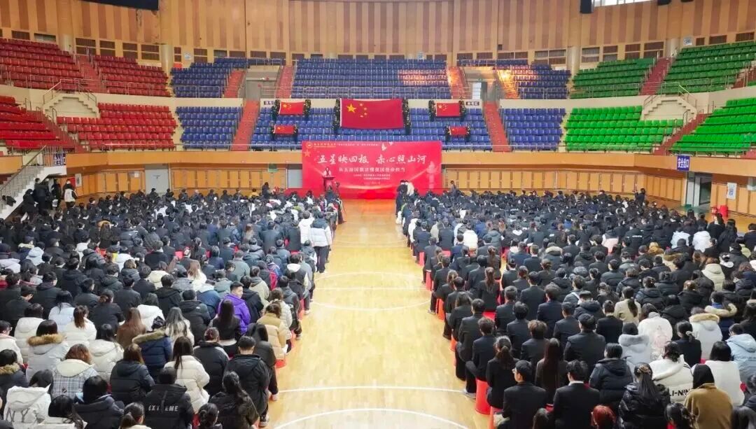 2025年11月12日,学校在体育馆内隆重举行“五星映四极,赤心照山河——从五面国旗读懂强国使命担当”主题升旗仪式暨“国旗下的思政课·场馆里的思政课”。校党委副书记、工会主席郭砾,党委常委、宣传部(党委教师工作部)部长张艳君,党委常委、组织部部长王羽,学生工作部(学生处、武装部)、校团委、学生就业指导处等相关职能部门负责人,各学院党委副书记、辅导员及千余名学生共同参与,沉浸式聆听这场铸魂润心、励志笃行的思政大课。仪式由校团委书记刘春玲主持。