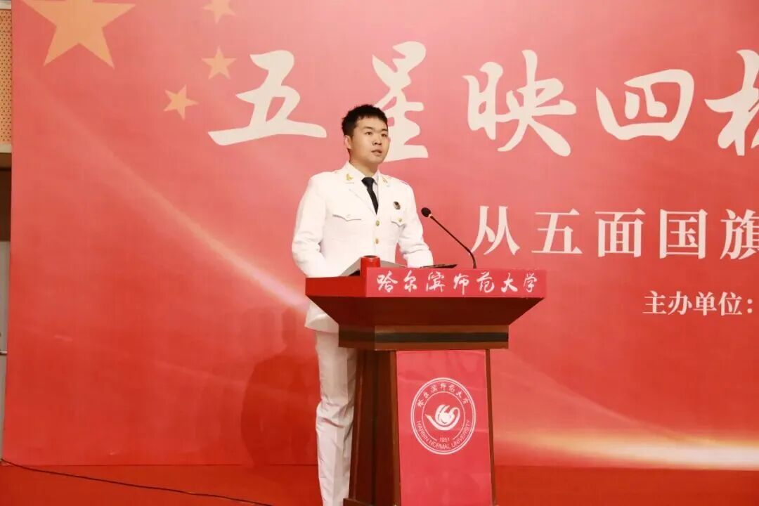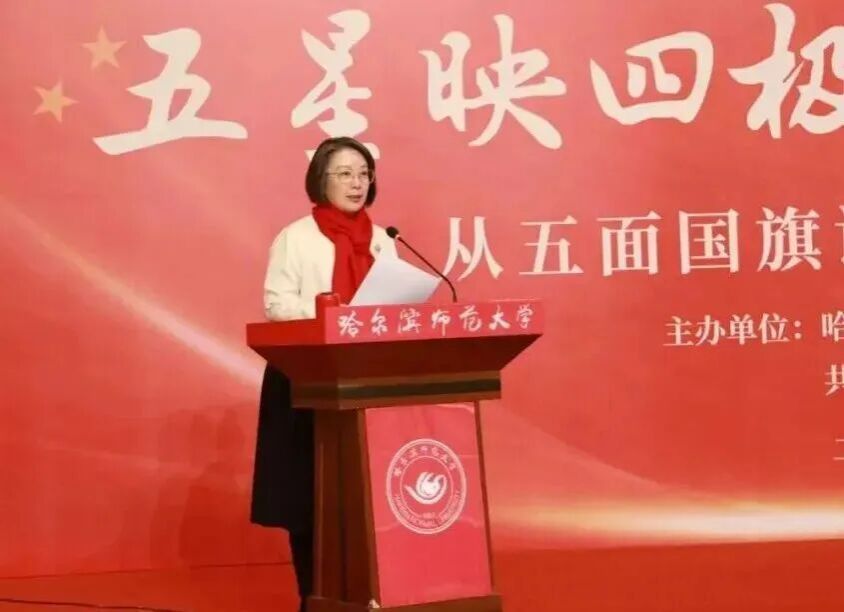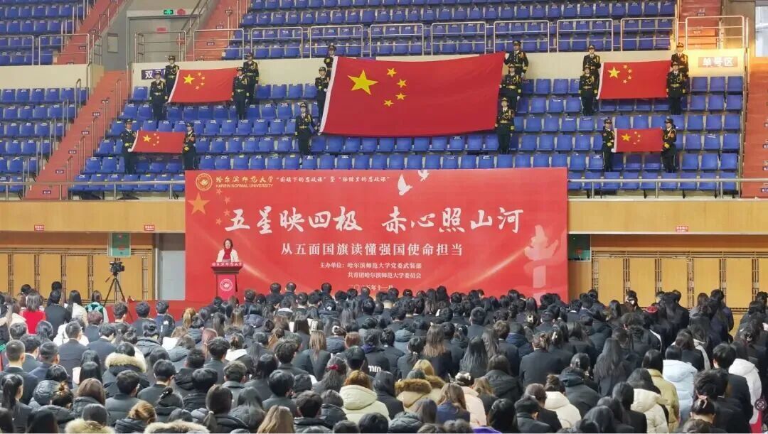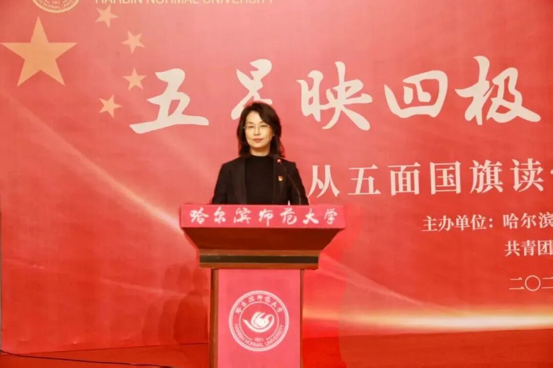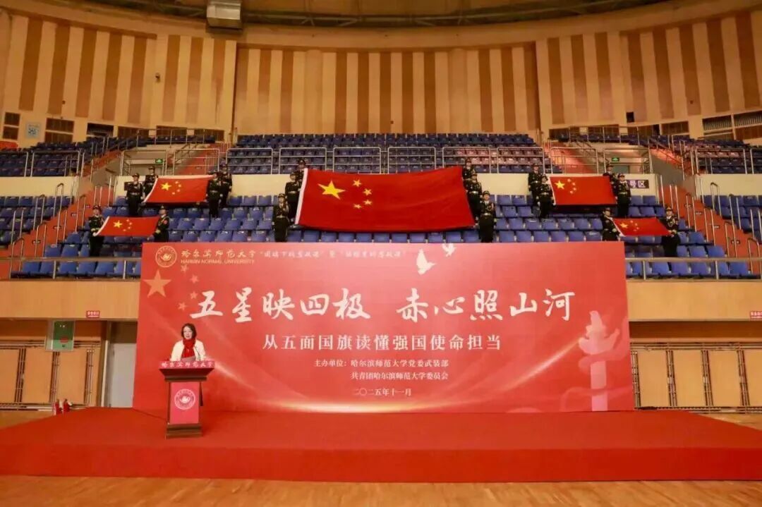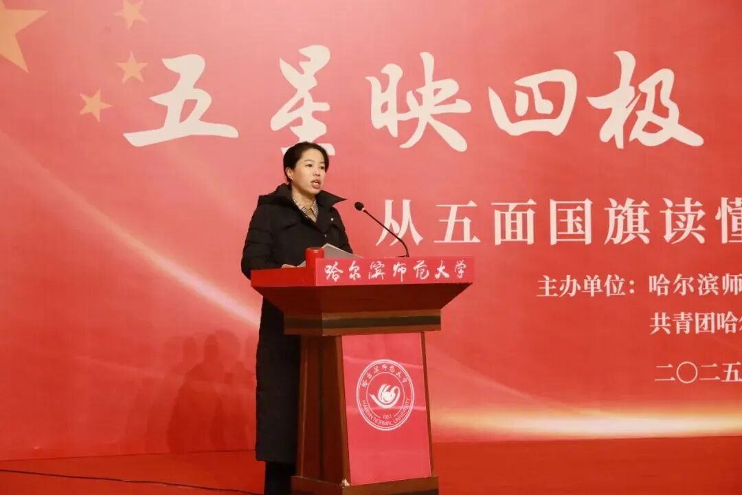 校党委副书记、工会主席郭砾以《集五方之帜 铸信仰之基——来自祖国“四极一心”的力量》为题,讲授了一堂深刻生动的“国旗下的思政课·场馆里的思政课”。她表示,五面国旗串联祖国四极与心脏,凝聚着边疆卫士的赤诚与全国人民的同心伟力,每一面都镌刻着忠诚与坚守,也承载着哈师大学子扎根边疆、报效祖国的赤诚担当。从北极寒疆的坚毅守望,到东极哨所的青春蜕变;从南海礁盘的寸土不让,到西陲大地的深深扎根,再到天安门广场国旗承载的国家嘱托,每一段故事都回答着“强国建设,青年何为?”的时代命题。更加坚定了哈师大学子“身在最北方,心向党中央”的政治忠诚。全体师生备受鼓舞、热血沸腾,掌声经久不息。