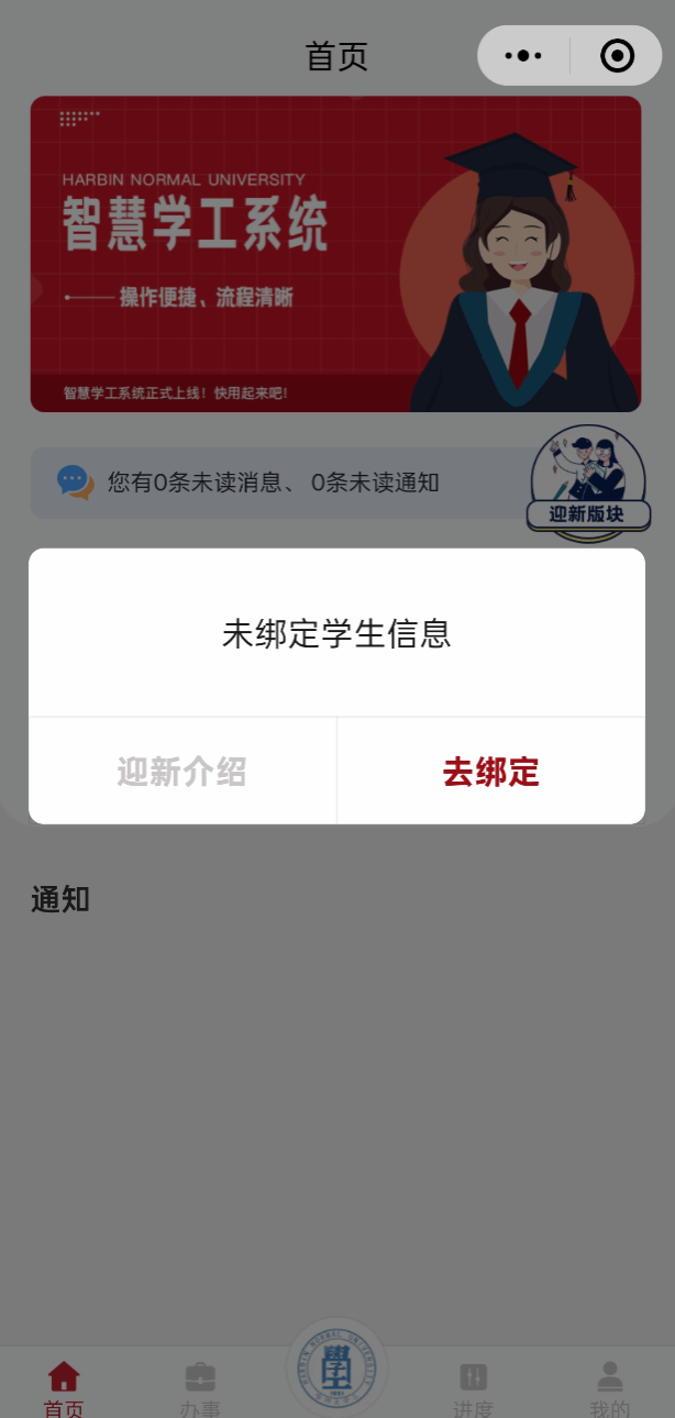 首次进入校园迎新页面需阅读相关管理规定,点击确定后可以查看迎新办理、个人信息展示、迎新进度、迎新介绍、我的迎新等板块。