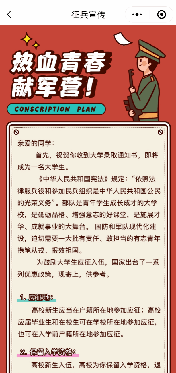 【迎新介绍】页面包括学校简介、校园风采、入学须知、资助政策、征兵宣传等相关信息。