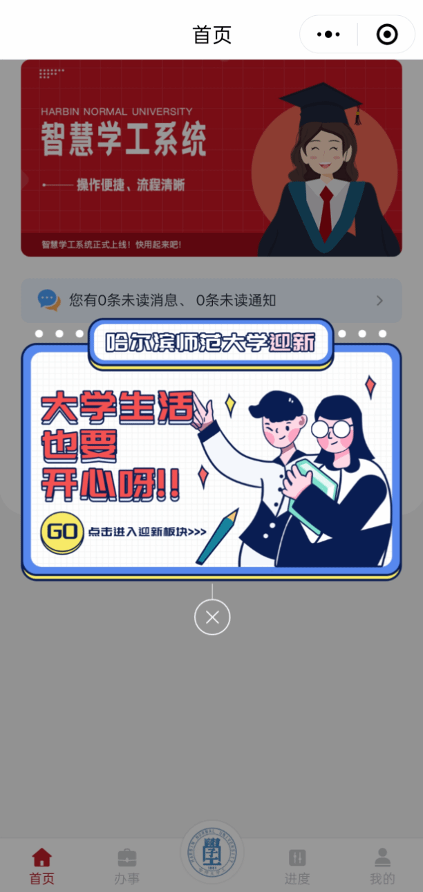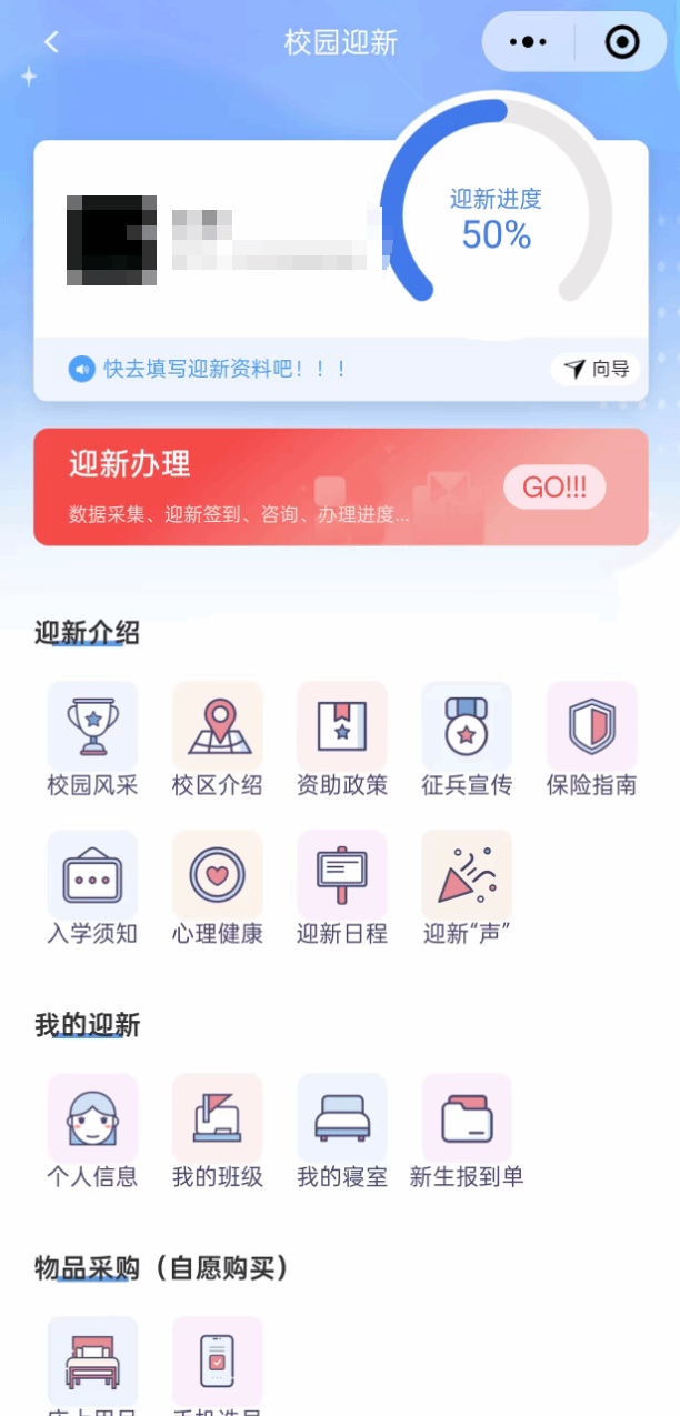 点击迎新板块或点击弹出框进入迎新功能。