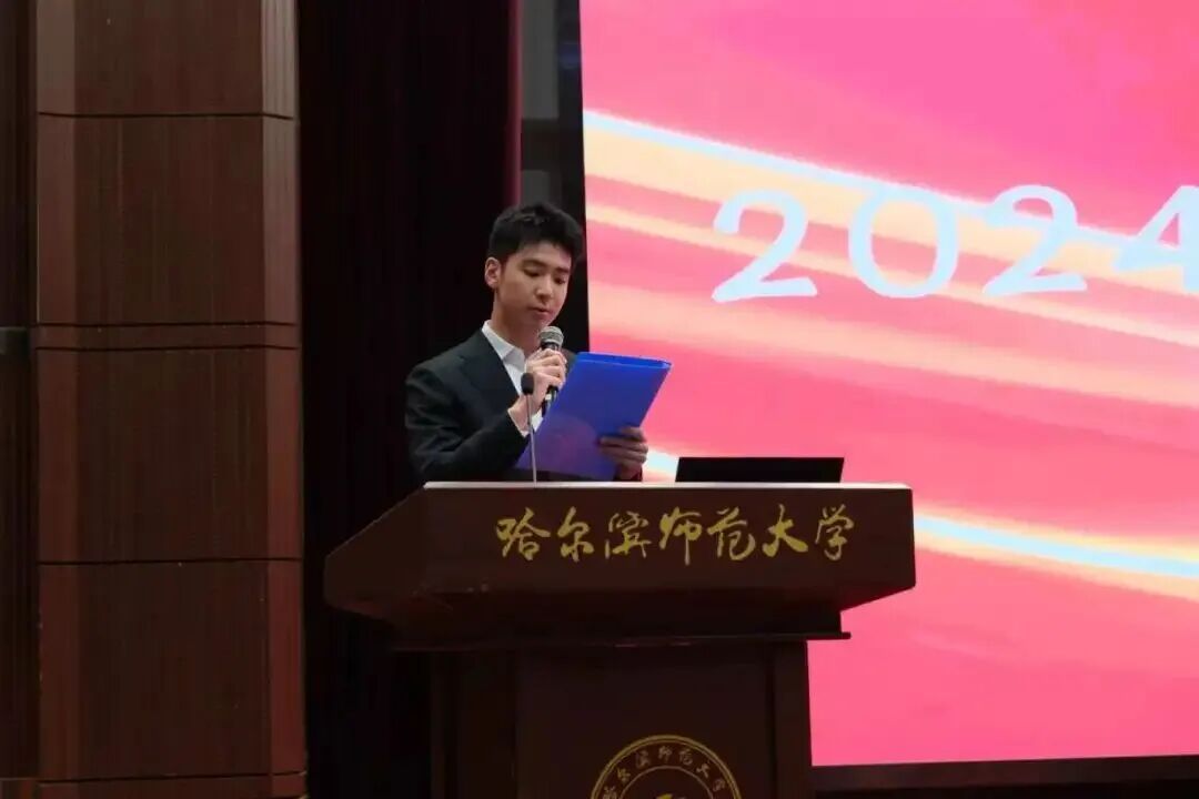 典礼第二项,本科生新生代表、2025级地理科学专业常瑜发言。她代表全体本科新生向学院领导与老师们致以诚挚感谢,并表示来自各地的新生汇聚于哈师大地理科学学院,是求学路上的重要里程碑,也是一个全新的起点。她谈到,大家期待在这里涵养师德、夯实专业基础,依托学院的科研优势,在老师引领下积极参与前沿项目,促进理论与实践相结合,用奋斗书写大学时光,努力成长为合格的新时代地理人。
