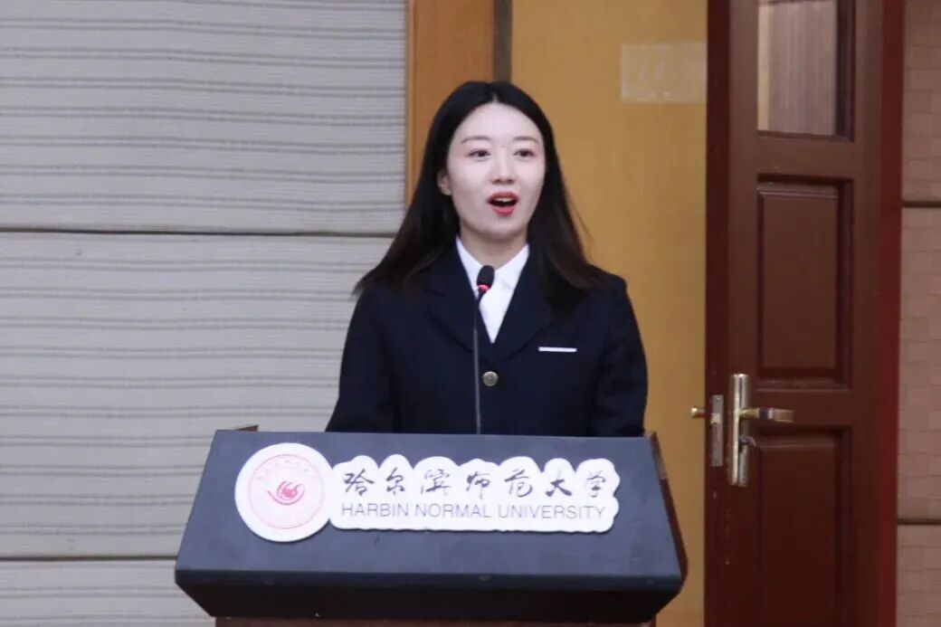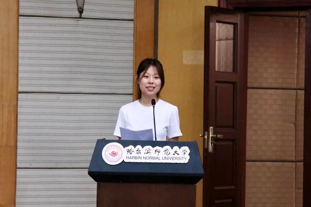 研究生新生代表、2025级日语笔译专业闫涵分享成长故事,她提及军人家庭传承的坚韧品格,以及受哈师大东语学院校友启蒙的逐梦历程。她表示将以“苔花如米小,也学牡丹开”的志向,锚定学术目标,牢记“敦品励学,弘毅致远”校训,在专业领域深耕细研,把个人理想融入民族复兴伟业,用真才实学为青春答卷增色。