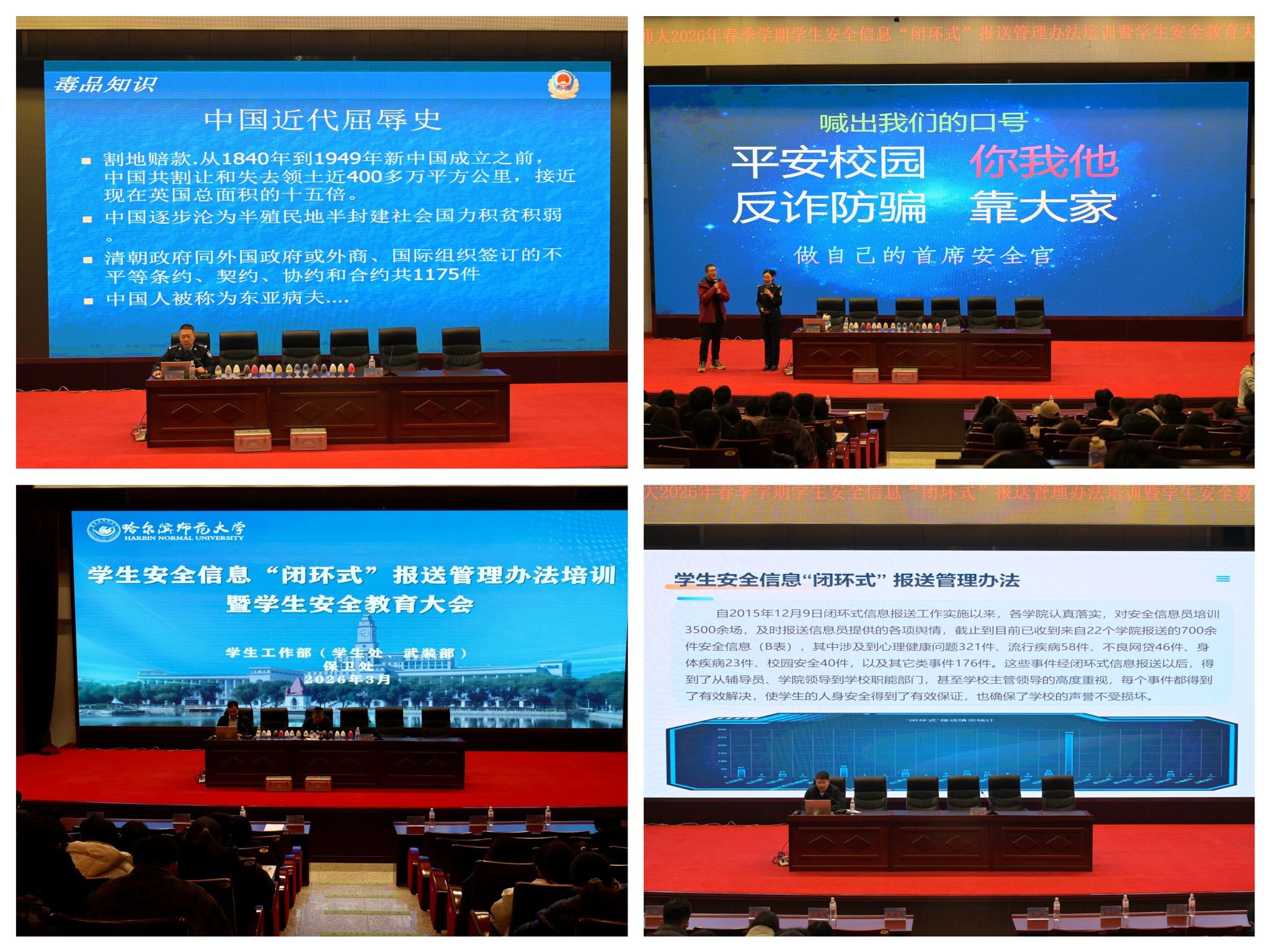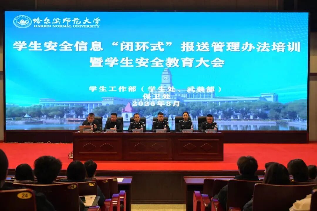 为进一步深化校警联动机制,全面落实新学期校园安全管理工作要求,筑牢平安校园防线,3月11日下午,我校联合哈尔滨市公安局松北分局在主校区科学会堂举行公安普法进校园暨新学期学生安全教育大会。哈尔滨市公安局松北分局相关负责同志,学校相关职能部门负责人,各学院学工办主任及学生代表参加。