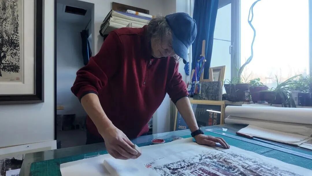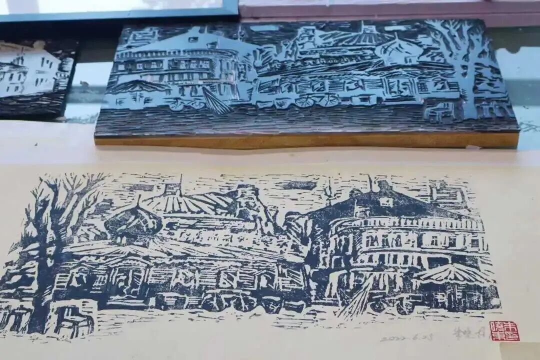 活动现场,朱晓东老师现场演绎冰上雕刻技艺,细致讲解了冰版画创作的关键技巧,指出需根据冰体硬度灵活调整刀法与力度,在传统木刻版画的工艺基础上,融入冰雪材质的独特语言,形成刚柔并济的艺术风格。朱晓东老师提到,从一次冰灯制作中的偶然发现,到开创一门独立的艺术形式,他将非遗版画与冰雪文化相结合,自制工具、攻克低温创作难题,让冰与墨在纸上定格。他的作品承载着哈尔滨的文化基因,城市地标与历史风貌在其刀下转化为独特的艺术符号,成为了一部镌刻在冰版之上的城市文化标志。