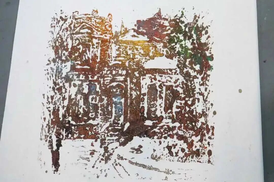 演示结束后,活动进入实践教学阶段。朱晓东老师结合冰版透明特质与自然肌理,从构图设计、走刀力度,到油墨滚刷与拓印技巧,分步讲解、亲手示范,引导团队成员逐步掌握冰版画创作的基本流程。大家纷纷表示,亲手刻冰拓印的过程既新鲜又充满挑战,不仅真切感受到冰版画“刀随冰走、墨落纸生”的独特魅力,更对非遗传承的匠心与坚守有了更深刻的理解。