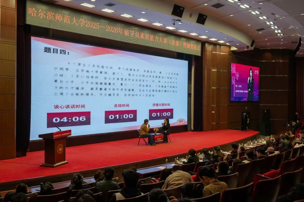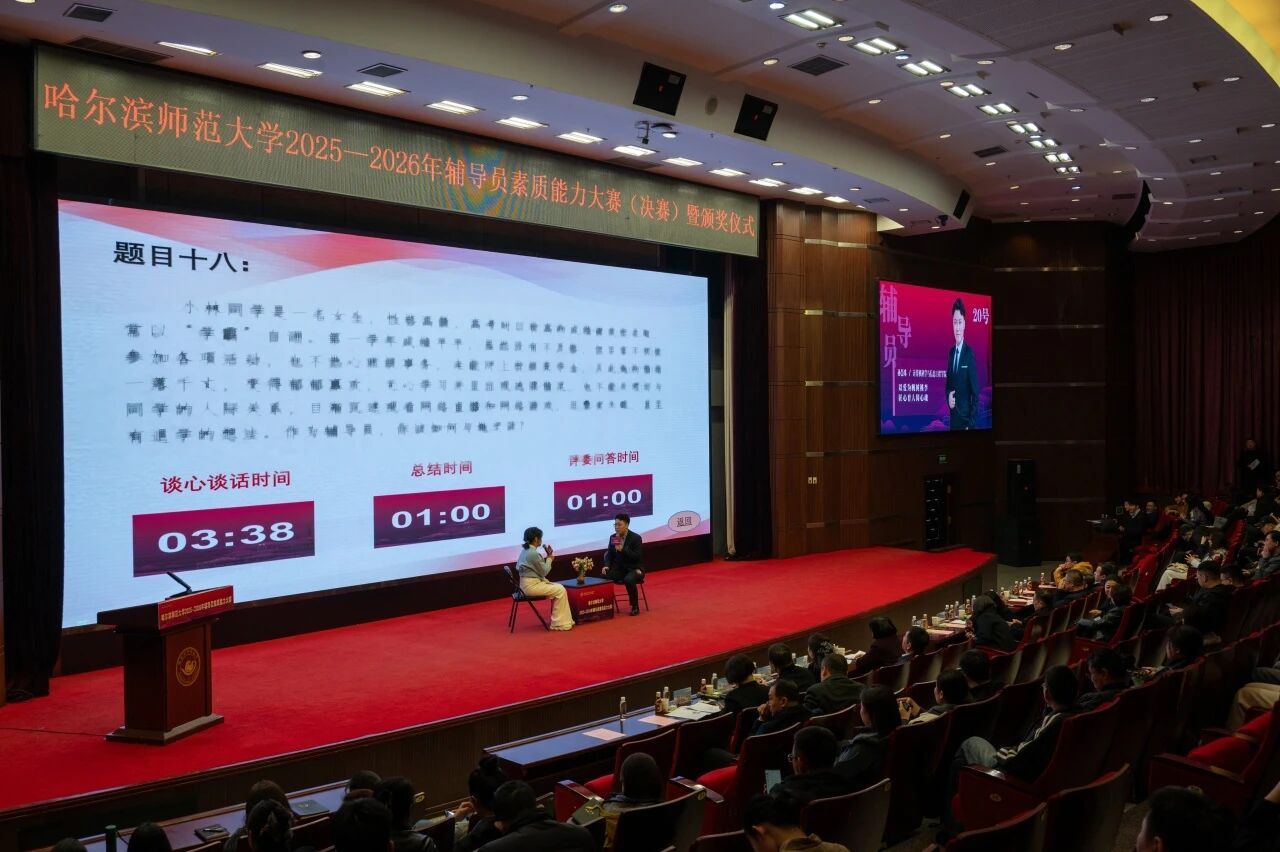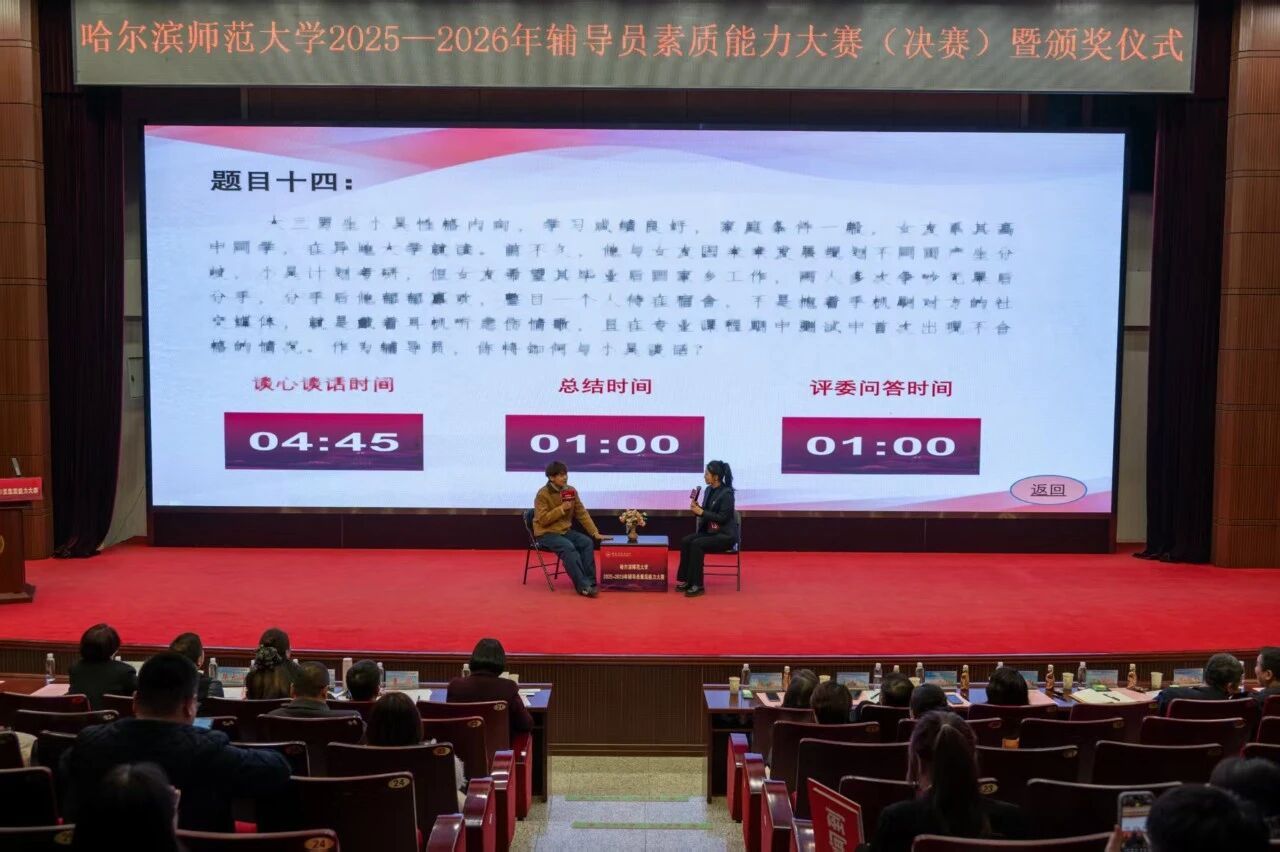 为深入贯彻落实全国、全省教育大会精神,全面落实新时代立德树人工程,聚焦“第四支队伍”建设,不断提升我校辅导员队伍的理论水平、职业能力和专业素养,着力构建全员全过程全方位全领域育人新格局。3月25日,哈尔滨师范大学辅导员素质能力大赛(决赛)暨颁奖仪式在科学会堂成功举办。校党委副书记、工会主席郭砾出席活动。学校相关职能部门负责人、各学院党委副书记,全体辅导员,本硕博学生代表及兄弟院校近百名辅导员同仁到场观摩。决赛特邀东北林业大学、哈尔滨理工大学、黑龙江中医药大学、哈尔滨学院、黑龙江职业学院学工领域专家领导共同担任评委。